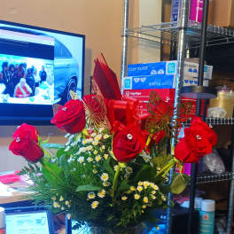 Price: $150.00 One sided Large Red and White Floral Basket Product Tags: Best seller Same-day Delivery