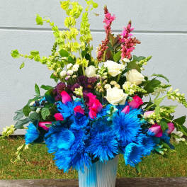 Price: $150.00 Large beautiful yellow and blue and white standing funeral basket Product Tags: Same-day Delivery