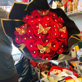 Price: $80.00 PINK AND RED ROSES WITH BLACK WRAPPING AND GOLD BUTTERFLIES Product Tags: Same-day Delivery